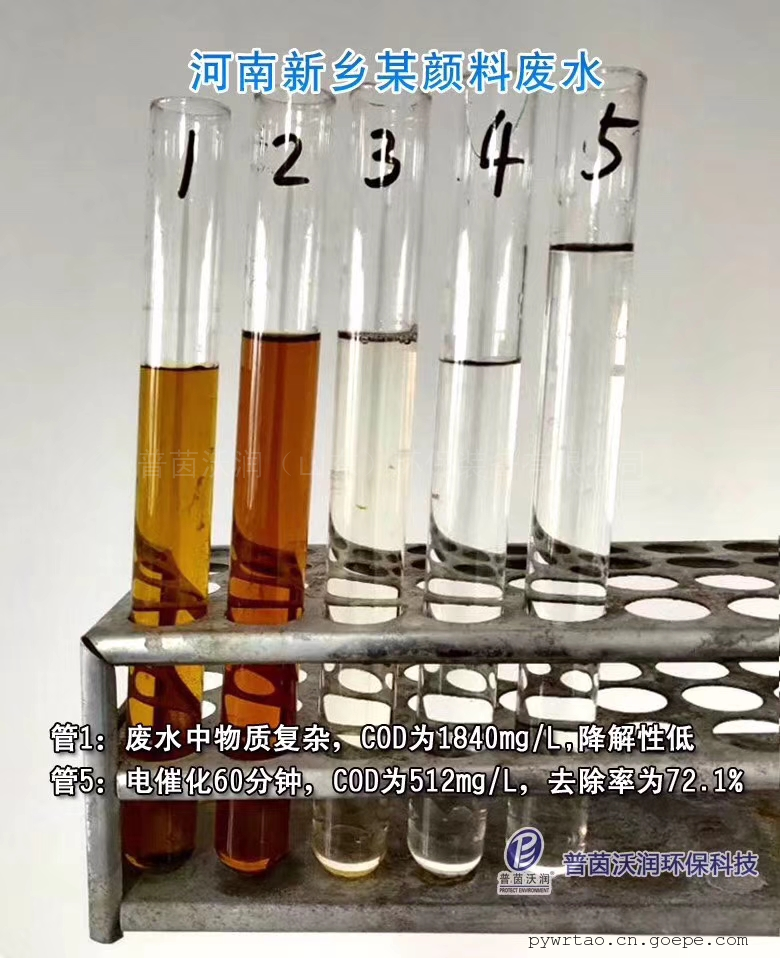 江西某染料废水,原水cod为11808mg/L,电催化60分钟,cod降到1440mg/L,去除率87.8%。 -